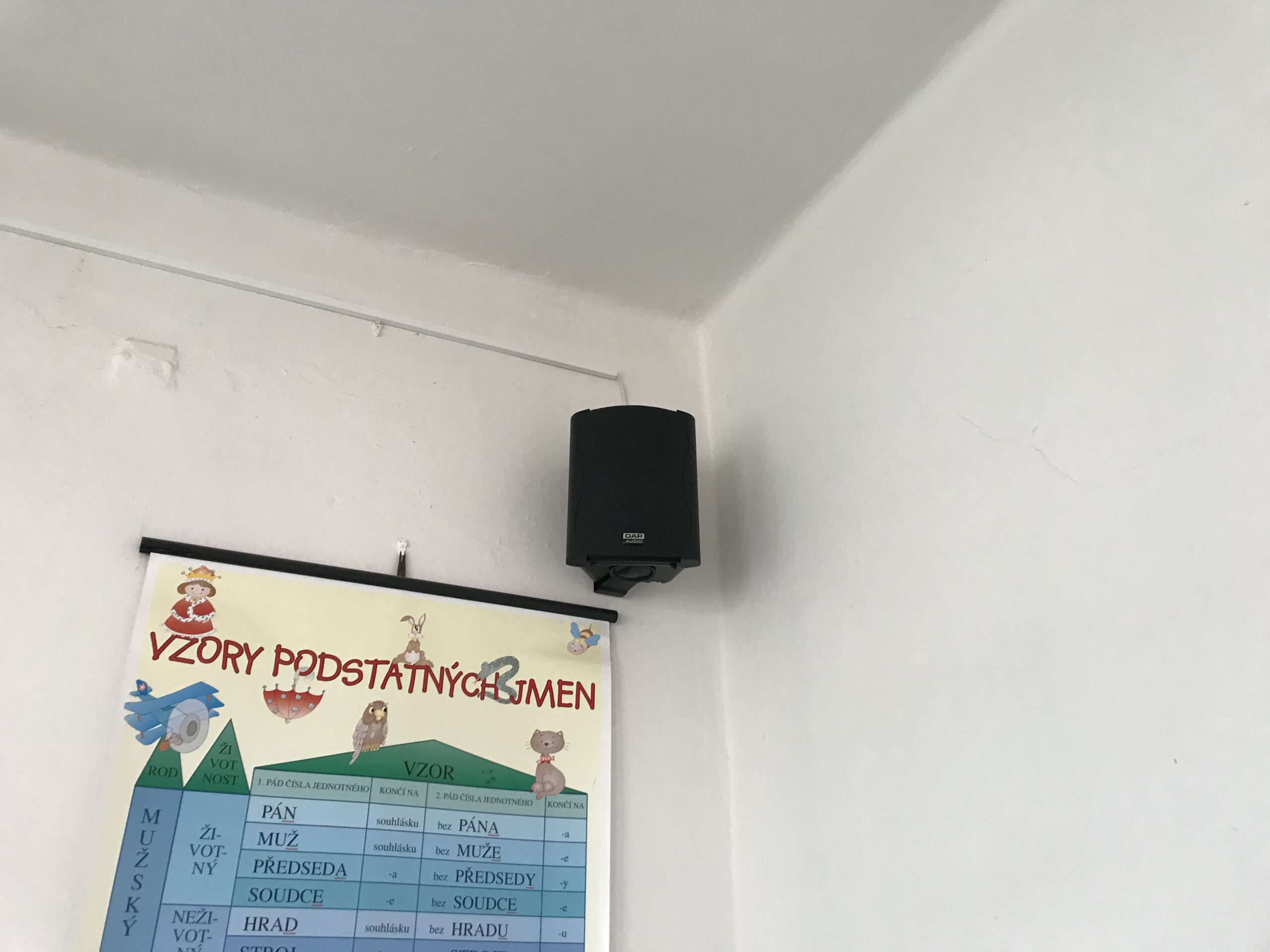 V každé třídě byl našim technikem instalován pár černých reproboxů DAP-Audio PRA-62, k tomu potřebná kabeláž, audio isolátor a možnost zapnutí a připojení jakéhokoliv audio média pomocí konektoru Jack 3,5. Výuka je nyní díky dostatečnému ozvučení na mnohem lepší úrovni!